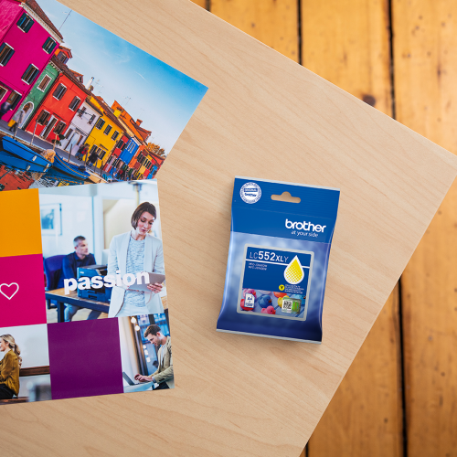 Originálna žltá atramentová kazeta Brother LC552XLY s vysokou výťažnosťou je vhodná na častú farebnú tlač s jasnými odtieňmi. Ponúka výťažnosť až 1 500 strán podľa normy ISO/IEC 24711.