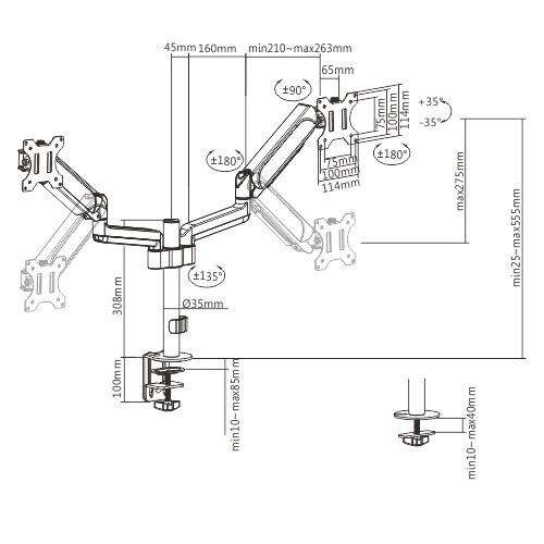 - Pre 2 monitory až 32" s nosnosťou 1–9 kg na rameno